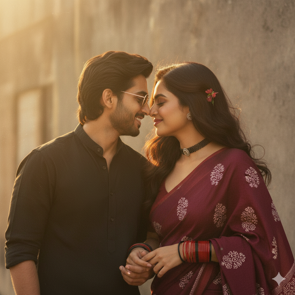 Prompt - 4 Create Romantic couple portrait, man and woman smiling with eyes closed, the exact same face as the uploaded image (no alteration, 100% identical). gently touching noses in a playful, intimate moment. Woman wearing a deep maroon saree with white ethnic block prints, red bangles, and a black oxidized choker necklace. Man with dark medium-length hair, short beard, wearing a simple black outfit. Warm golden-hour lighting, soft blurred natural background, dreamy cinematic atmosphere, close-up shot capturing love and joy